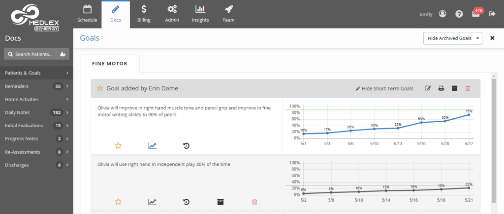 Graphically track patient progress. View patient progress during daily notes and place progress graphs of individual goals in patient reports.