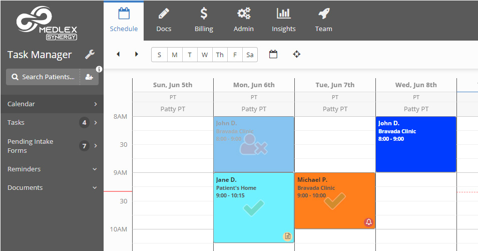 Compare staff schedules on the fly. View all therapists’ calendars from one screen, then sort or filter by location and specialty.